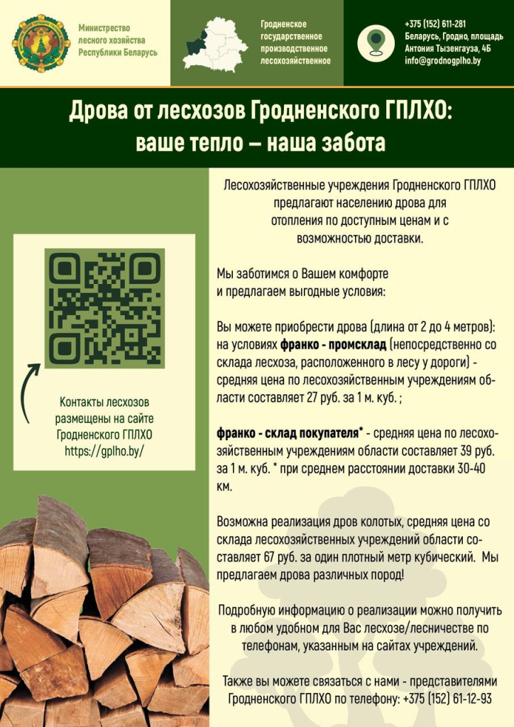 Всего лесхозами Гродненской области в этом году заготовлено 530 тысяч кубометров дров. Уже удовлетворено 10,5 тысячи заявок на поставку: населению реализовано порядка 75,5 тысячи кубометров. Для приобретения древесины нужно обращаться в ближайшее лесничество. Информация обо всех лесхозах региона указана на официальном сайте Гродненского ГПЛХО.