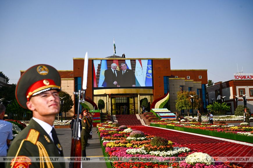 В аэропорту Душанбе Александра Лукашенко встречали премьер-министр Таджикистана Кохир Расулзода, министр иностранных дел Беларуси Максим Рыженков, Посол Беларуси в Таджикистане Виктор Денисенко и другие официальные лица.