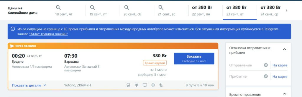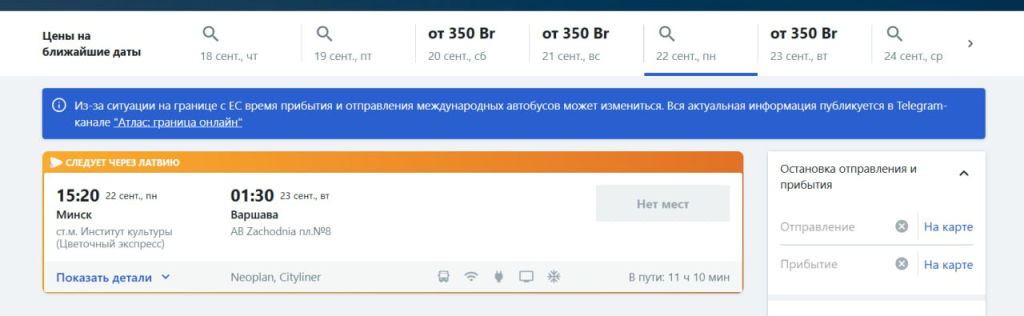 Один из вариантов – объезд закрытых границ через другие страны. На сайте atlasbus.by и в приложении Атлас открыта продажа билетов на два новых прямых рейса из Минска и Гродно в Варшаву, следующих через Латвию.