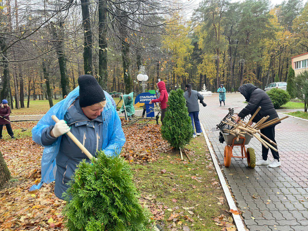 В санатории активисты провели уборку обширной лесо-парковой зоны: собрали опавшую листву и мусор. В итоге было приведено в порядок около двух гектаров земли. Собранная листва была аккуратно сложена в кучи для последующей утилизации. В ходе субботника мужская половина освободила место на складе от устаревшего оборудования столовой, которое отработало свой срок. Все ненужные предметы были аккуратно загружены на металлолом. Женщины в это время сделали генеральную уборку в столовой.